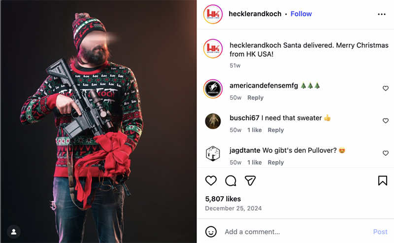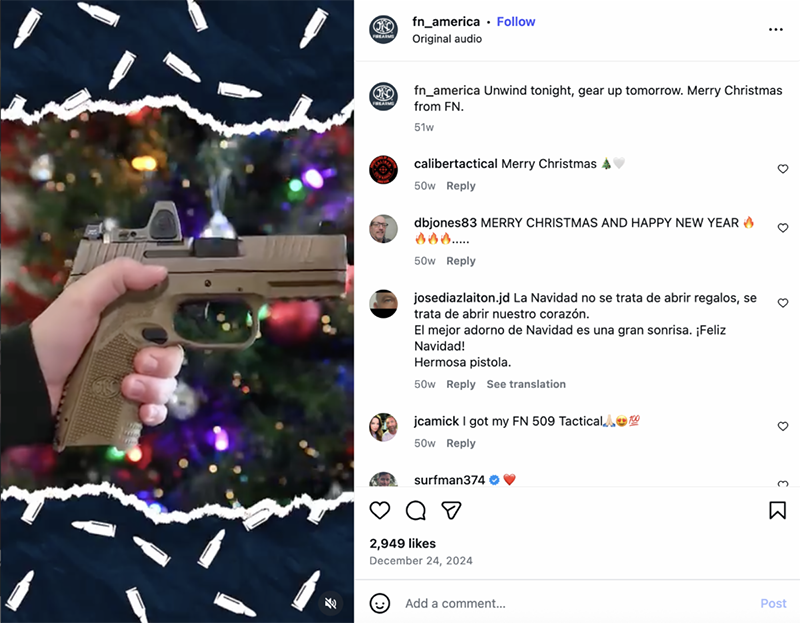 Below are examples of Christmas Instagram posts from gun manufacturers in 2024, plus the graphic from GOA’s current promotion of its heavily armed ornaments.
