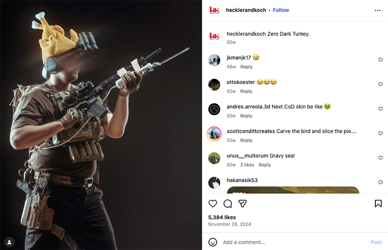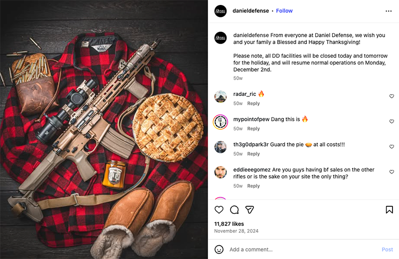 Below are just three examples of Thanksgiving posts from gun manufacturers in 2024. A slideshow with additional examples from previous Thanksgivings can be found here.